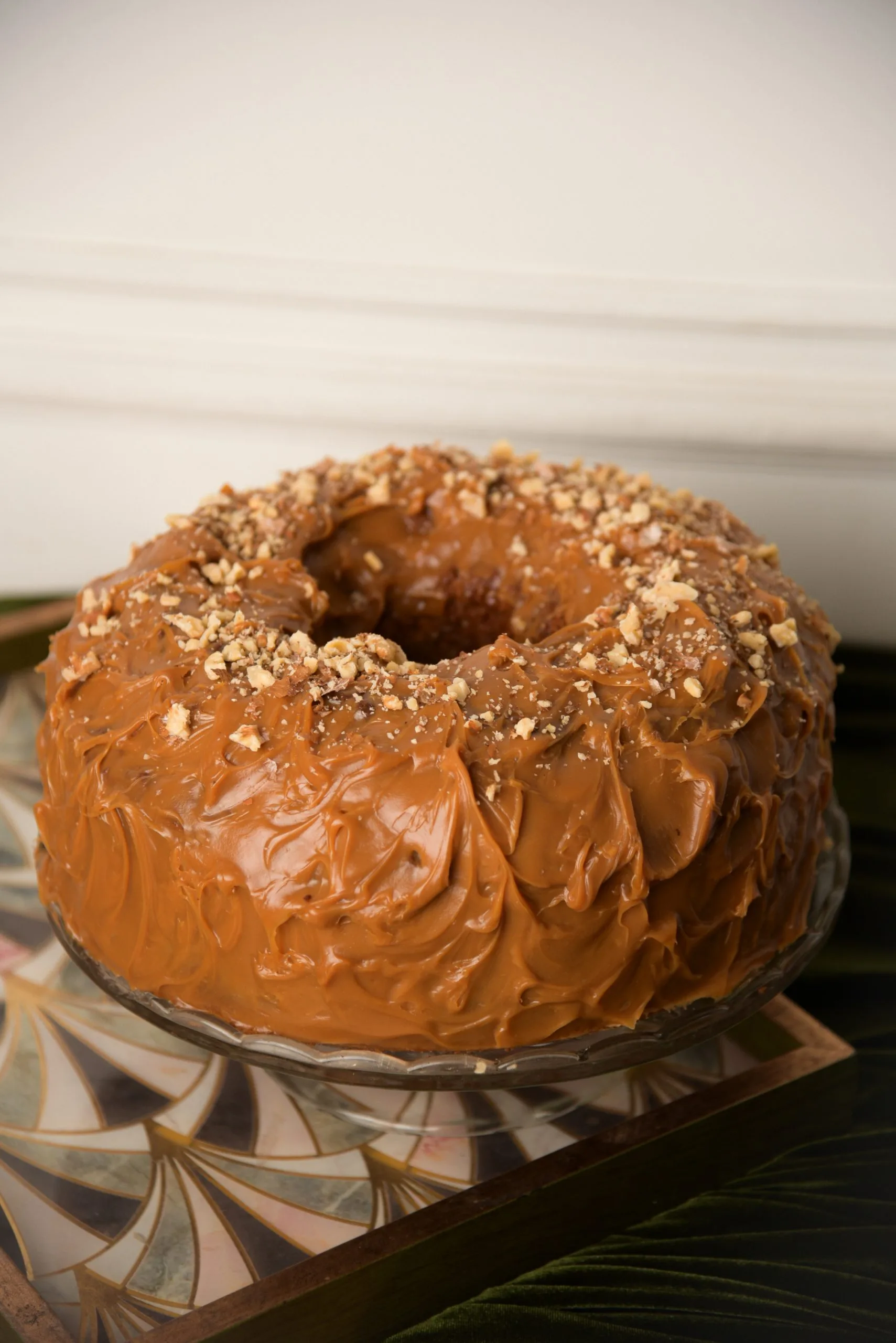Традиционен бананов кейк, с аромат на канела, ванилия, ядки, завършен с глазура от крема сирене, пудра захар и карамел.