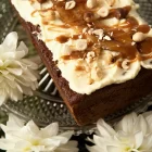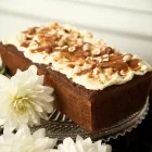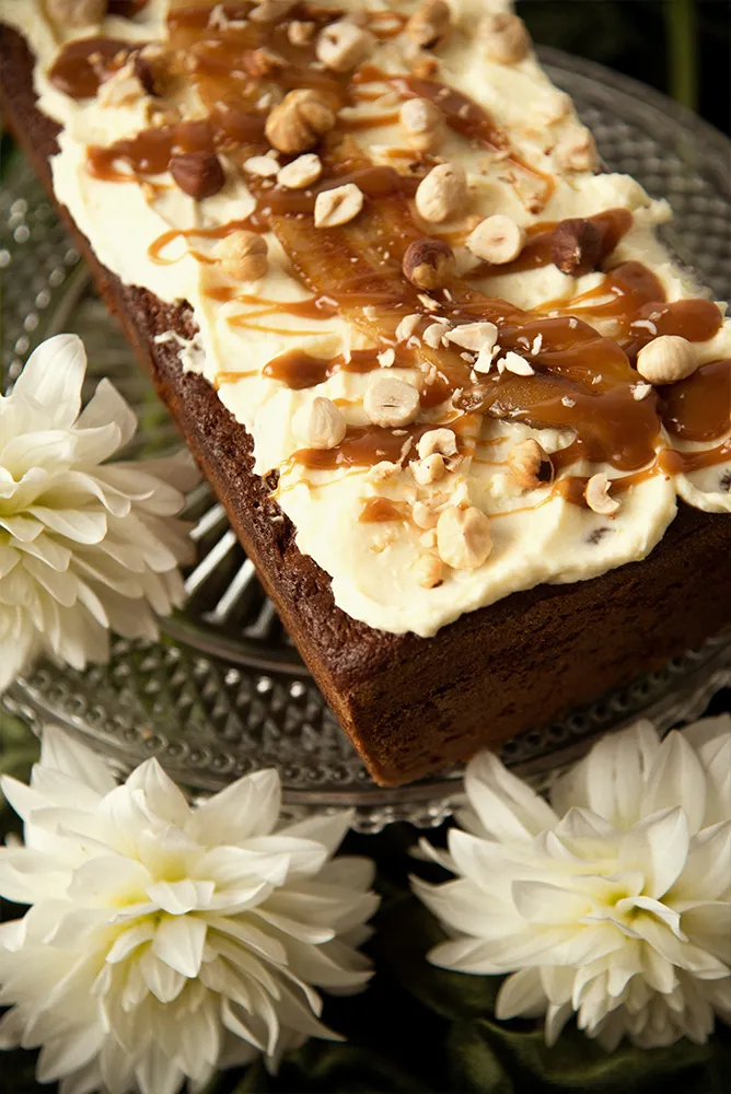 Традиционен бананов кейк, с аромат на канела, ванилия, ядки, завършен с глазура от крема сирене, пудра захар и карамел.