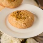 Маслени бисквити с кремообразен пълнеж от шамфъстъчена паста и парченца бял шоколад, поръсени с хрупкав шамфъстък.