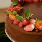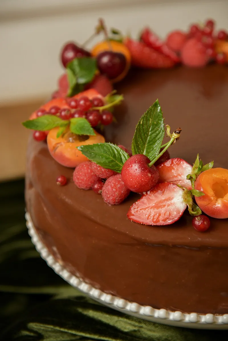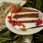 Какаови блатове, напоени с шоколадов сос, крем от маскарпоне, млечна сметана и бял шоколад. Завършена с шоколадов ганаш и плодова декорация.