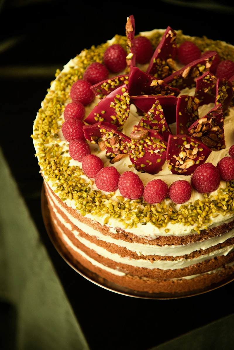 Блатове с пралирекс/ сто процента шамфъстъчена паста/, крем от крема сирене, маскарпоне, пралине и малиново кули.